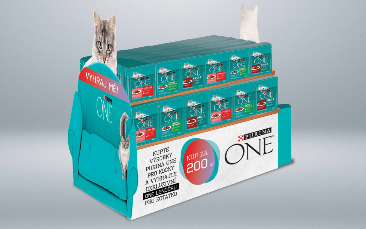 Návrh POS materiálů pro společnost PURINA. Do návrhu jsem zakomponoval pohovku. Výhra v soutěži byla lenoška pro kočky. Na ukázkách je grafické zpracování čela regálu a paletového vystavení.